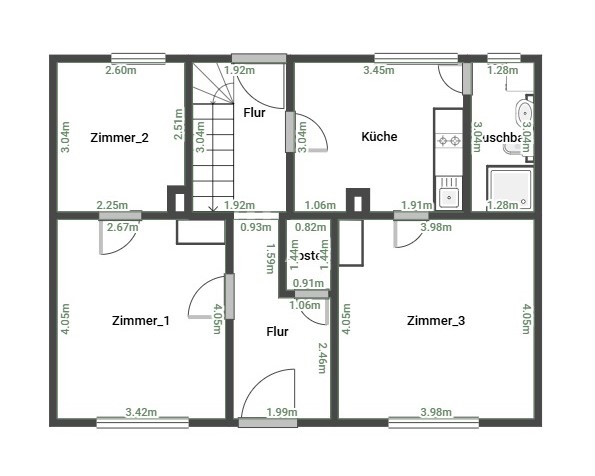 Das Haus verfügt über zwei Wohnebenen mit insgesamt sechs Zimmern, Küche, Bad, WC sowie Fluren und Abstellbereichen. Die Raumhöhen betragen ca. 2,35 m im Erdgeschoss und ca. 2,39 m im Obergeschoss – damit entsteht ein angenehmes Raumgefühl.
