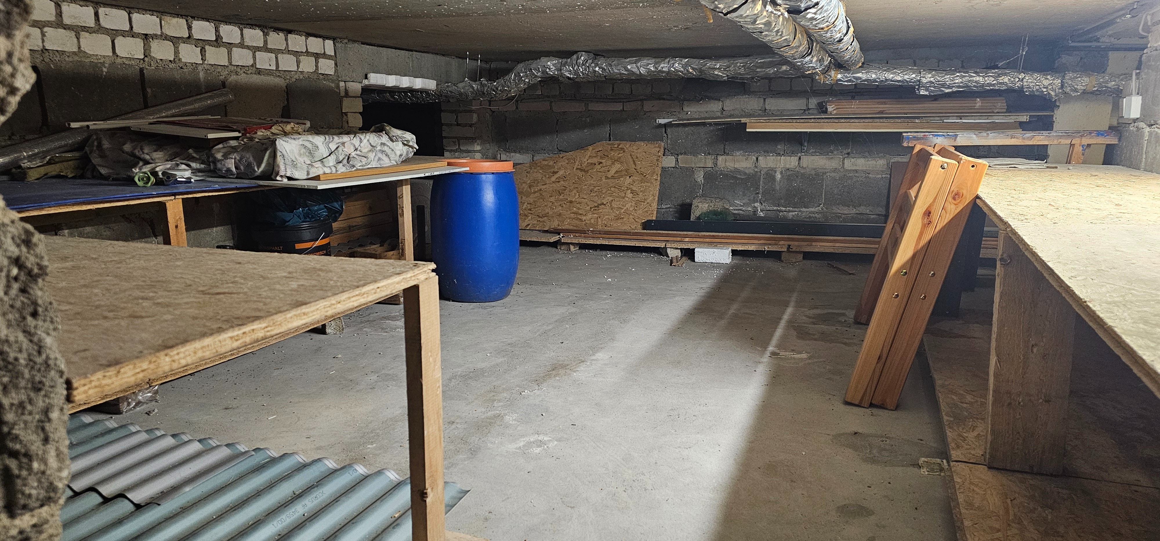 Unter dem gesamten Gebäude befindet sich ein Kriechkeller. Die zugängliche Höhe ist begrenzt, doch der Bereich eignet sich hervorragend als Lagerfläche für alles, was nicht täglich gebraucht wird – von Werkzeug und Baumaterial über Reifen bis hin zu Gartenmöbeln in der Winterpause. Gleichzeitig erleichtert der Kriechkeller den Zugang zu Leitungen und Installationen, was langfristig Wartung und eventuelle Modernisierungen vereinfacht.