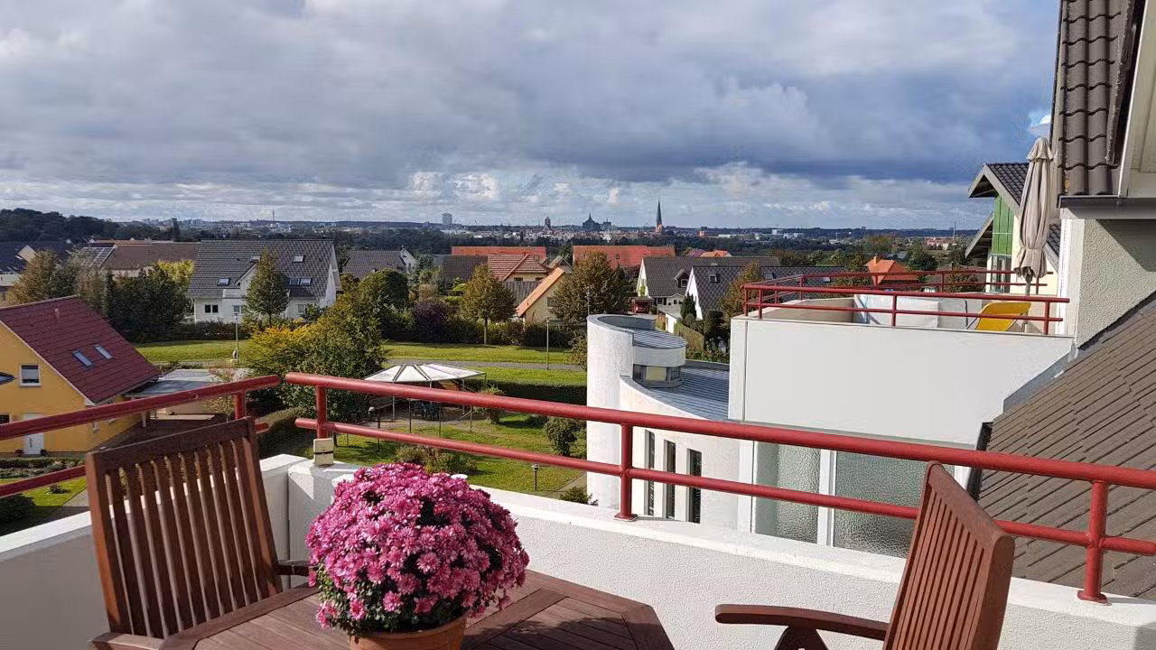 Referenzobjekt aus unserer Praxis: eine 3-Zimmer Dachgeschosswohnung in Brinckmanshöhe (18055 Rostock) mit Balkon, Einbauküche und Wannenbad. Dazu ein Tiefgaragenstellplatz und praktische Abstellflächen – diskret dargestellt, ohne Preis- oder Mieteinnahmen.